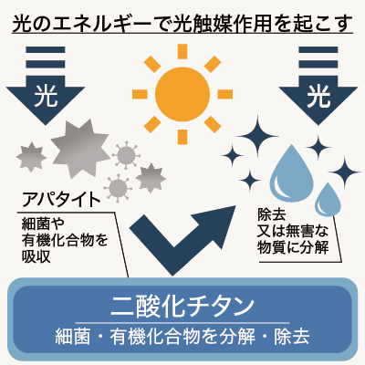 一般的な光触媒コーティングは「二酸化チタン」を主成分とし、光(紫外線)が当たることよって化学変化による触媒効果が生まれる触媒コートです。