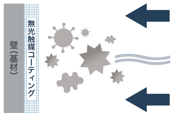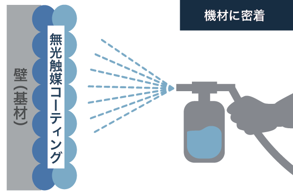 「無光触媒」は、光による触媒効果を必要とせず、空気中に浮遊するウイルスや菌など対象物質が、無効触媒の施工面に触れることで効果を発揮、物質を浄化するので